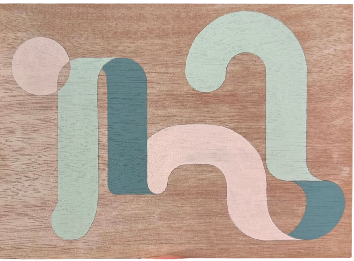 Pale pink, green and muted jade acrylic geometric flow painting on pale hardwood board.