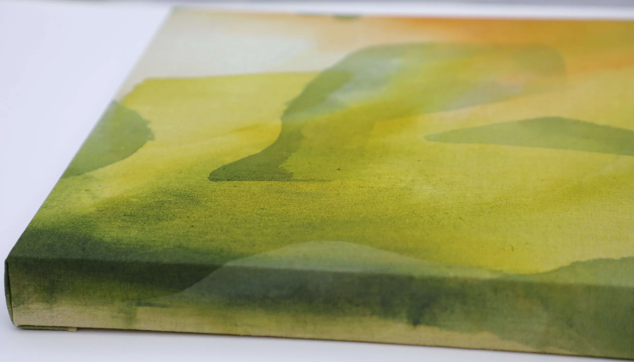 Artwork inspiration: Autumn was just beginning and the saturated colours of summer were fading away, with leaves losing some of their vivid green and giving way to softer shades of green and yellow. The low and warm glow of sunsets throughout these canopies can be felt through this painting which brings those content and happy feelings to a room allowing the viewer to reflect on cherished moments in nature.